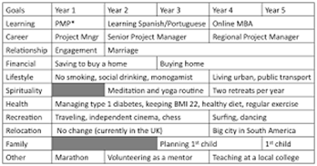 - Next, create an end goal in each of these sections, and work backwards to figure out what steps you can take in the next five years in order to achieve these goals.