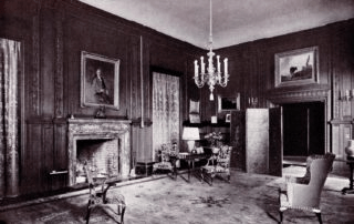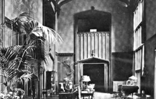 The Hall housed both an Aeolian organ and a small echo organ installed hidden behind the oak walls. The mantle of its imposing Belgian marble fireplace large enough to stand in is decorated with choir boys holding music sheets.