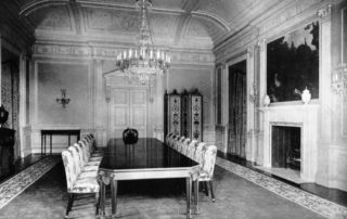“Freddie” said he brought artisans from Europe to do plaster detailing. They created Pompeiian “grotesque” panels in the Library, Robert Adam-style relief work in the dining room, and also ram’s heads in the corners of the billiard room ceiling.