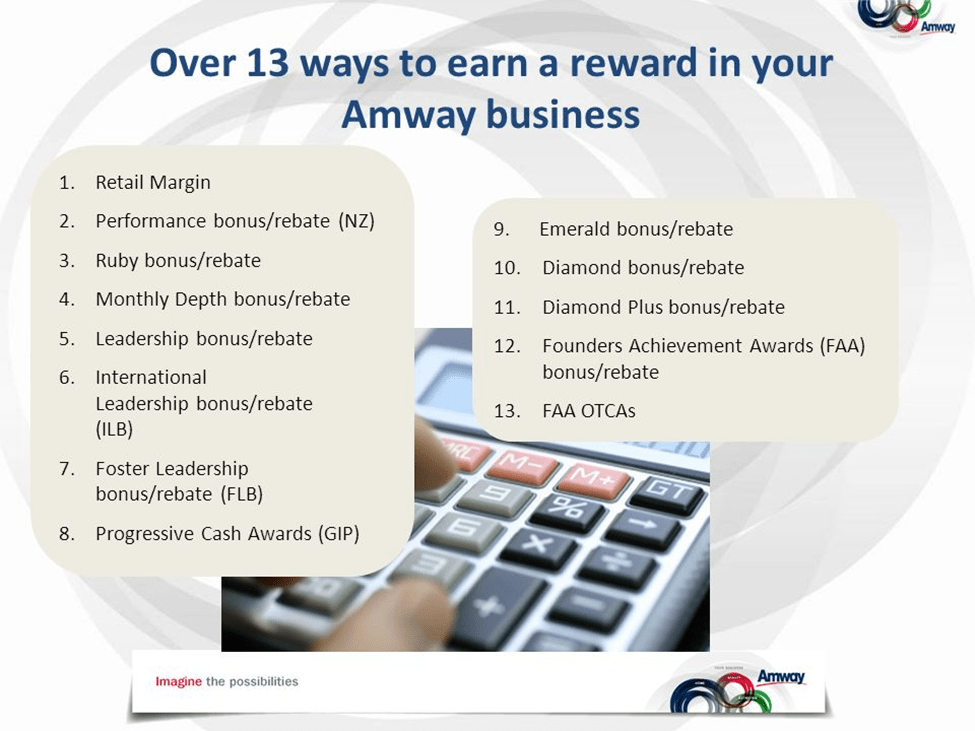 | Amway offers more than 450 products ranging from skin care to health supplements, so it’s safe to say you won’t run out of things to sell as an IBO. | Like all companies, there is a strong emphasis placed on sponsoring other people into the business so you can make commissions from their sales as well. |