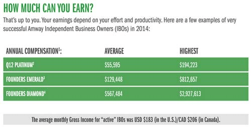 | The top-level distributors in Amway can earn some of the highest commissions in the industry, with yearly incomes in the high six and seven-figure ranges. | The company admits that only 48% of all IBOs are active and of the ones that are active doing the minimums, have average monthly gross income is only around $200. |