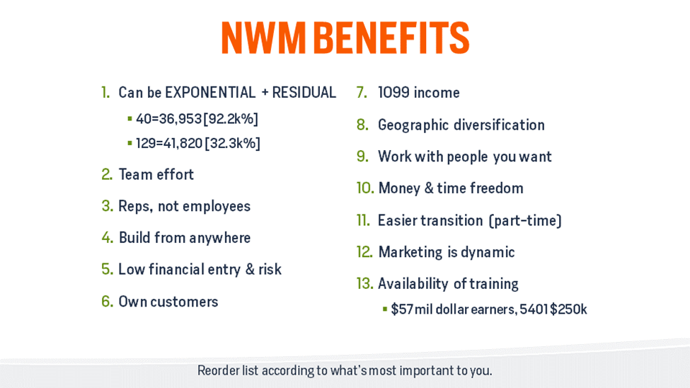 Something positive Great product or service, Unlimited income Residual income, Enjoy the people you work with, Time freedom, Something meaningful, Personal growth, Lots of perks, International, Contribution to worthy causes, Low risk, Low start-up costs, Economy-proof, Tax benefits, Fun!