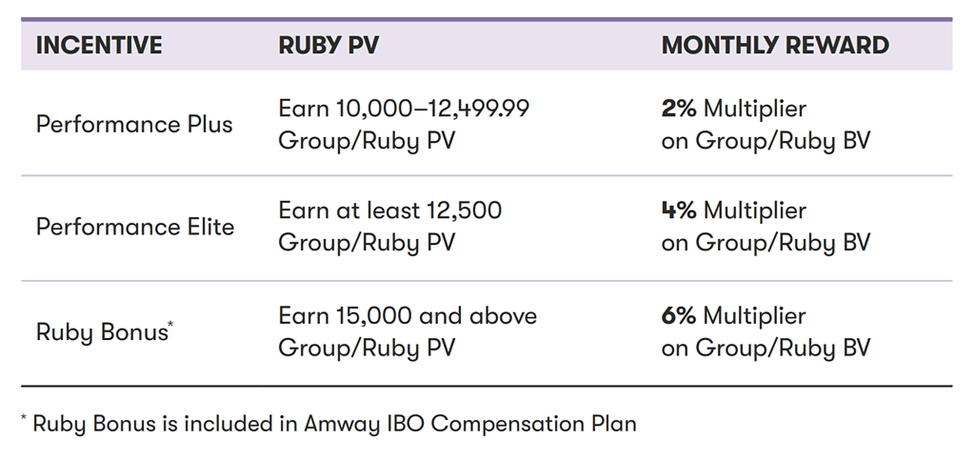 The Ruby Bonus is an additional bonus for IBOs who reach high PV levels, typically exceeding 15,000 PV in a month. It provides a percentage bonus on top of the regular performance bonuses.